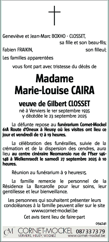 Décédée à Verviers (4800, Belgique) le mardi 23 septembre 2025 à l'âge de 90 ans
