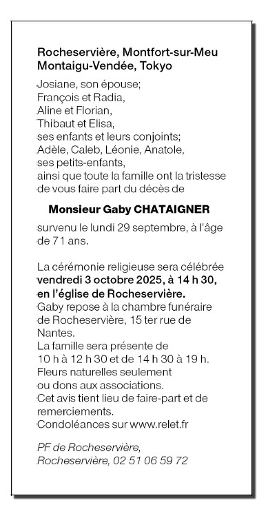 Décédé à Cugand (85610) le lundi 29 septembre 2025 à l'âge de 71 ans