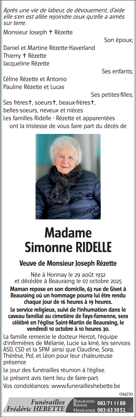 Décédée à Beauraing (5570, Belgique) le mardi 7 octobre 2025 à l'âge de 93 ans