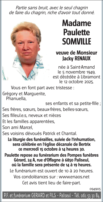 Décédée à Libramont (6800, Belgique) le lundi 13 octobre 2025 à l'âge de 75 ans