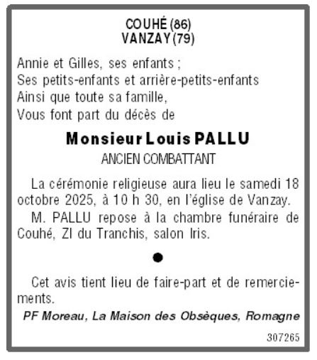Died in Lusignan (86600) on 14 October 2025 at the age of 90 years