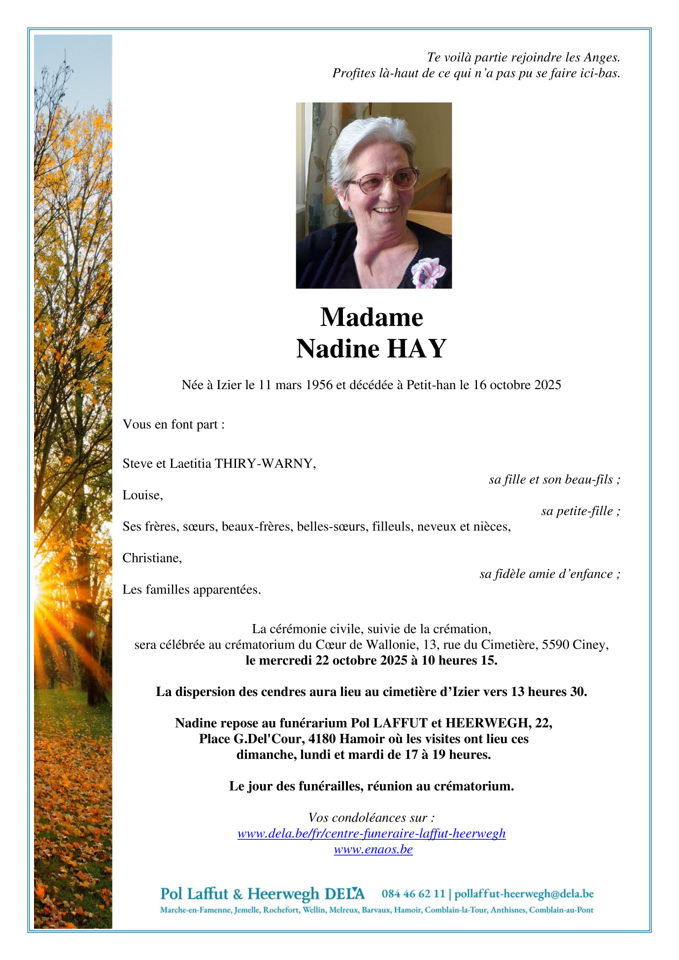 Décédée à Petit-Han (6940, Belgique) le jeudi 16 octobre 2025 à l'âge de 69 ans