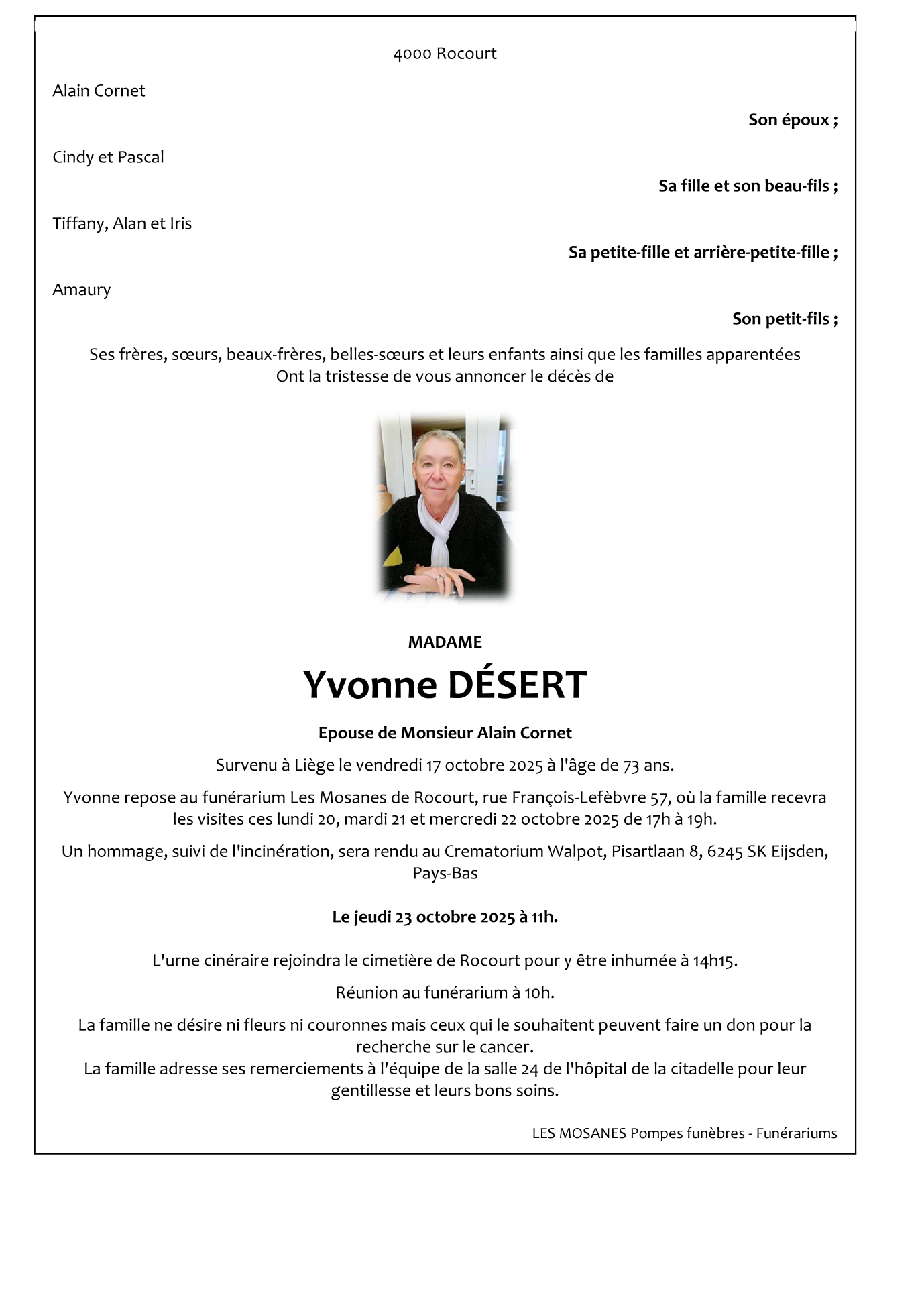 Décédée à Liège (4000, Belgique) le vendredi 17 octobre 2025 à l'âge de 73 ans