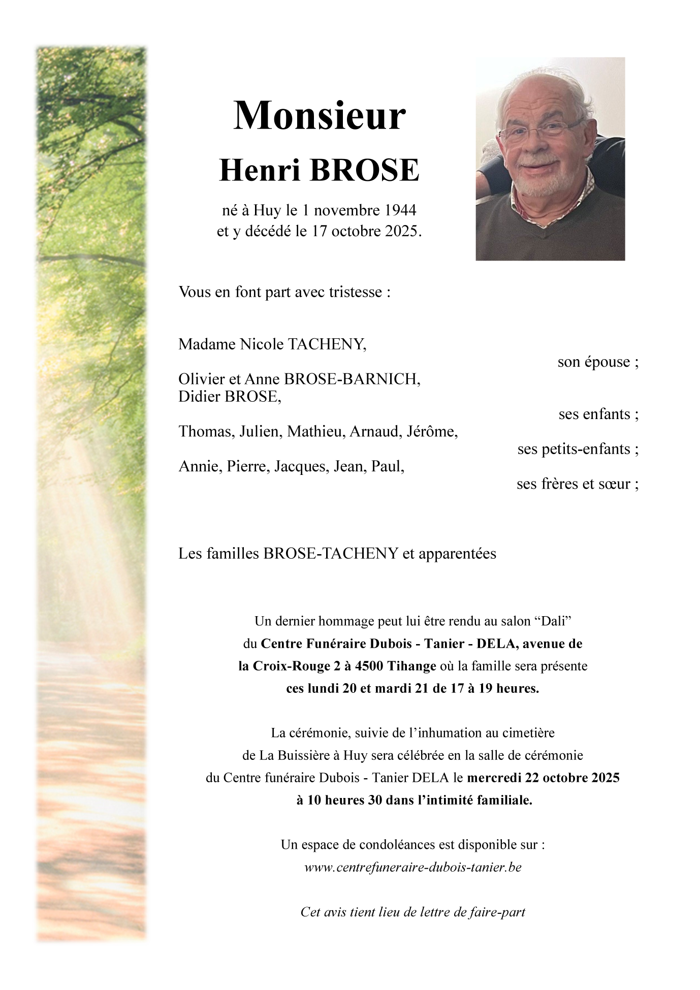 Décédé à Huy (4500, Belgique) le vendredi 17 octobre 2025 à l'âge de 80 ans