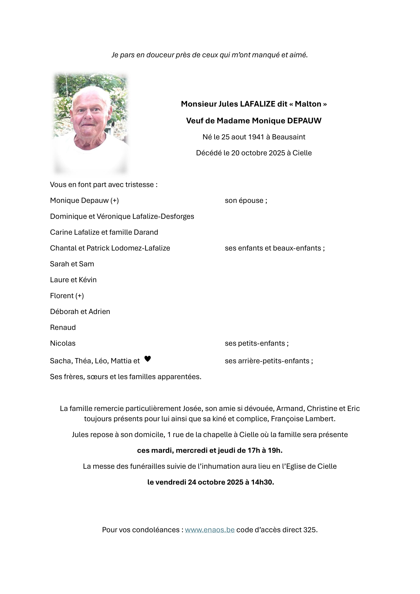 Décédé à Cielle (6980, Belgique) le lundi 20 octobre 2025 à l'âge de 84 ans