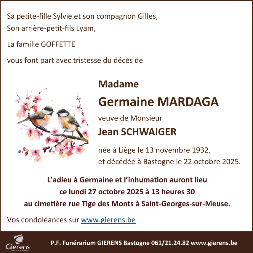 Décédée à Bastogne (6600, Belgique) le mercredi 22 octobre 2025 à l'âge de 92 ans