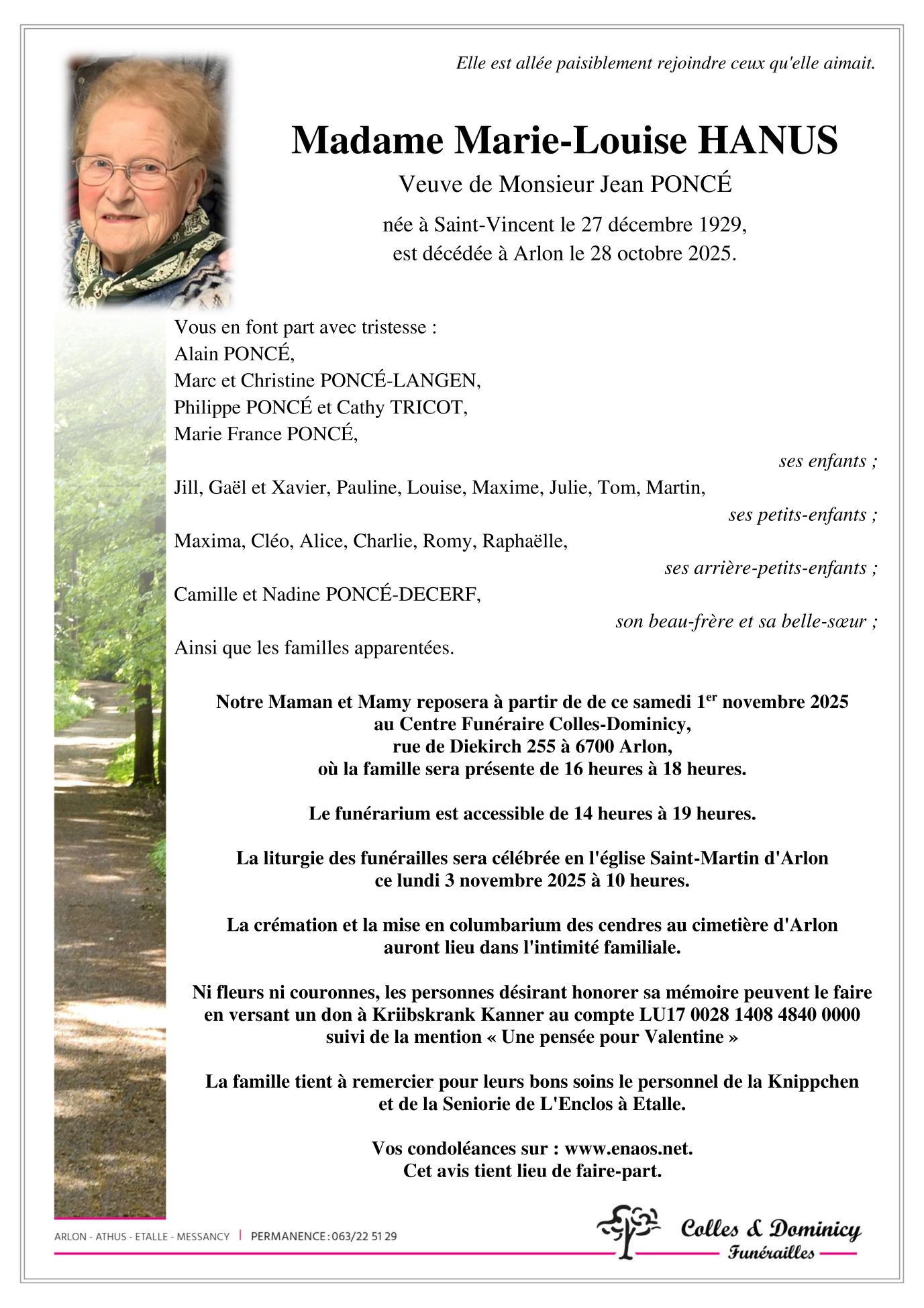 Décédée à Arlon (6700, Belgique) le mardi 28 octobre 2025 à l'âge de 95 ans