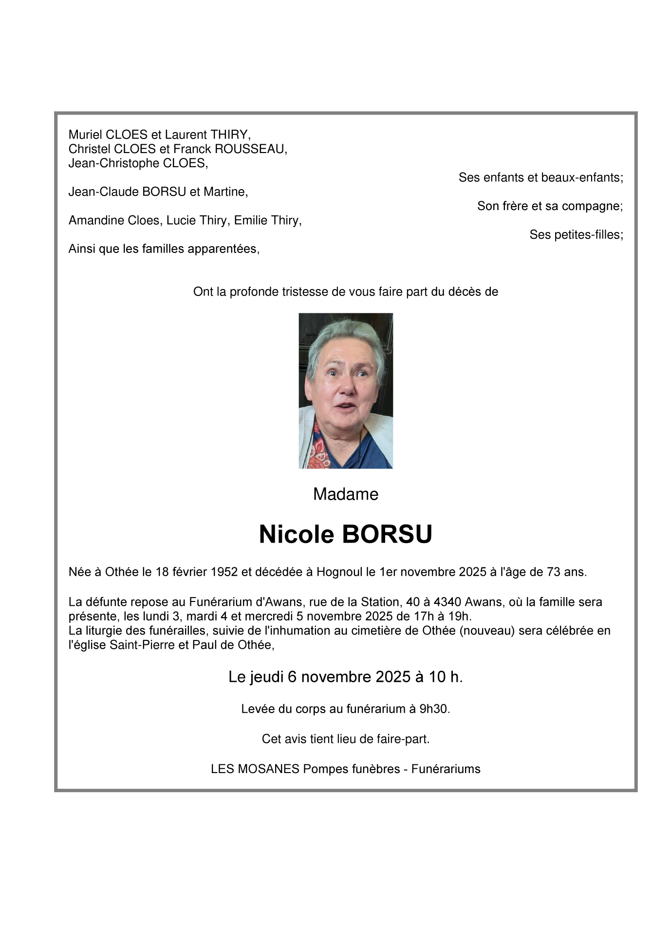 Décédée à Hognoul (4342, Belgique) le samedi 1 novembre 2025 à l'âge de 73 ans