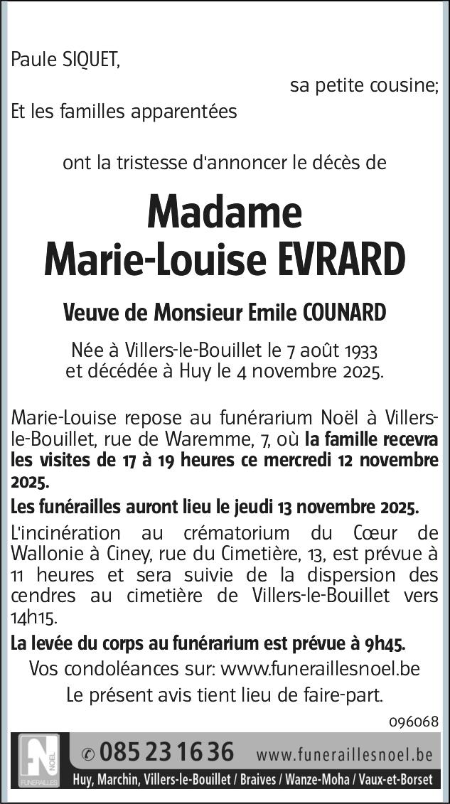 Décédée à Huy (4500, Belgique) le mardi 4 novembre 2025 à l'âge de 92 ans