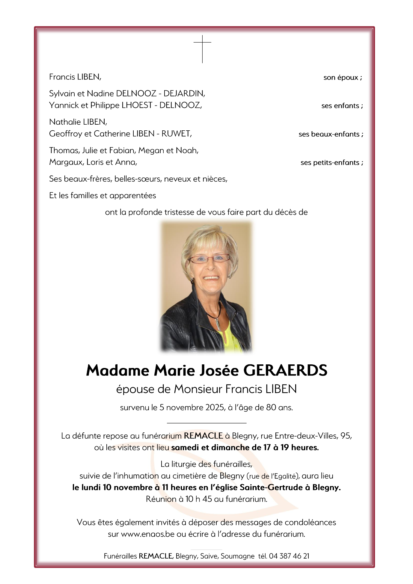 Décédée à Herstal (4040, Belgique) le jeudi 6 novembre 2025 à l'âge de 80 ans