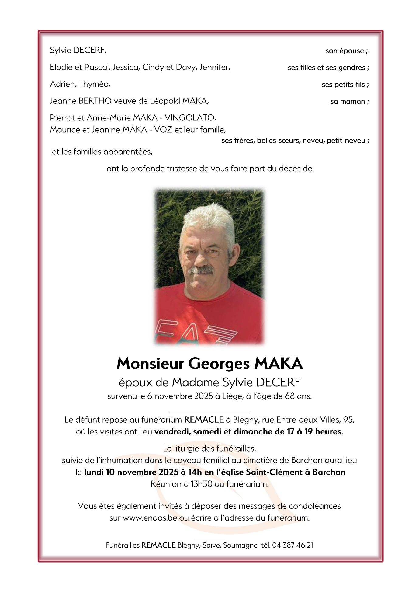 Décédé à Liège (4000, Belgique) le jeudi 6 novembre 2025 à l'âge de 68 ans