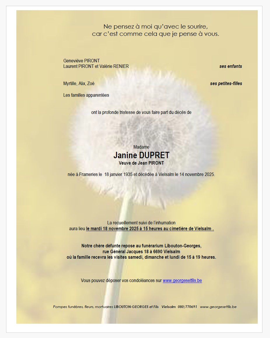 Fallecida en Vielsalm (6690, Bélgica) el viernes, 14 de noviembre de 2025 a la edad de 90 años