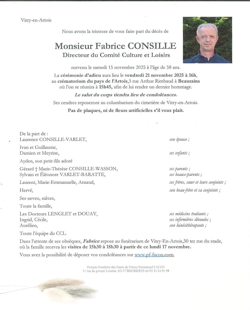 Décédé à Vitry-en-Artois (62490) le samedi 15 novembre 2025 à l'âge de 58 ans