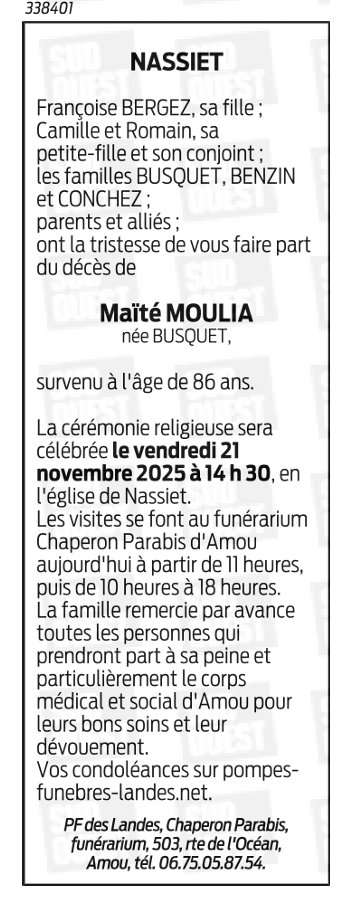 Décédée à Nassiet (40330) le mardi 18 novembre 2025 à l'âge de 86 ans