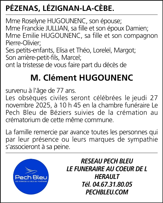 Décédé à Pézenas (34120) le samedi 22 novembre 2025 à l'âge de 77 ans