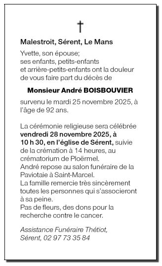 Décédé à Malestroit (56140) le mardi 25 novembre 2025 à l'âge de 92 ans