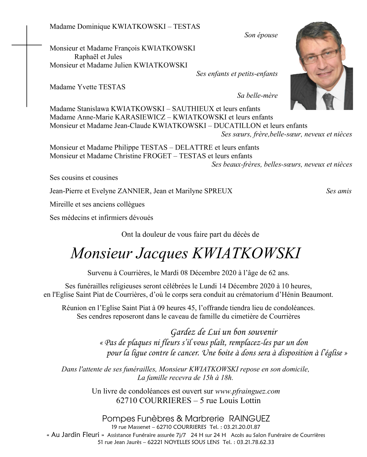 Died in Courrières (62710) on 08 December 2020 at the age of 62 years