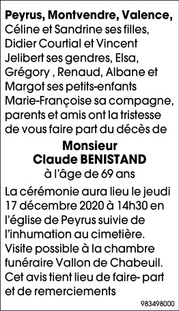 Died in Valence (26000) on 13 December 2020 at the age of 69 years
