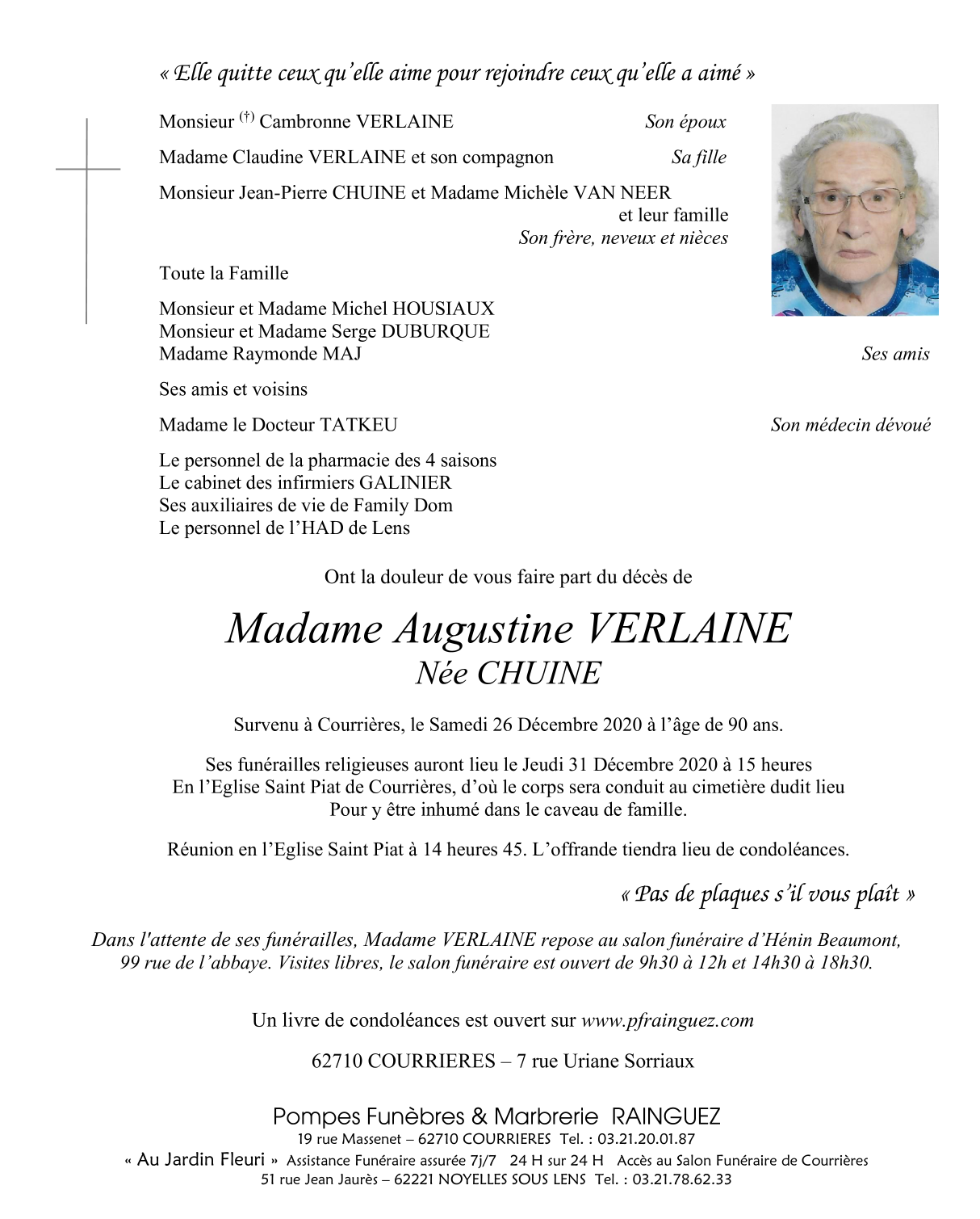 Décédée à Courrières (62710) le samedi 26 décembre 2020 à l'âge de 90 ans
