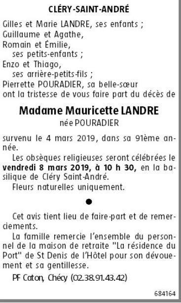 Décédée à Saint-Denis-de-l'Hôtel (45550) le lundi 4 mars 2019 à l'âge de 90 ans