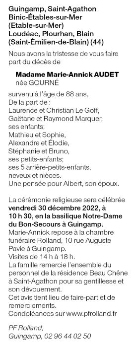 Décédée à Saint-Agnan (58230) le lundi 26 décembre 2022 à l'âge de 88 ans