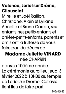 Décédée à Valence (26000) le samedi 29 janvier 2022 à l'âge de 99 ans
