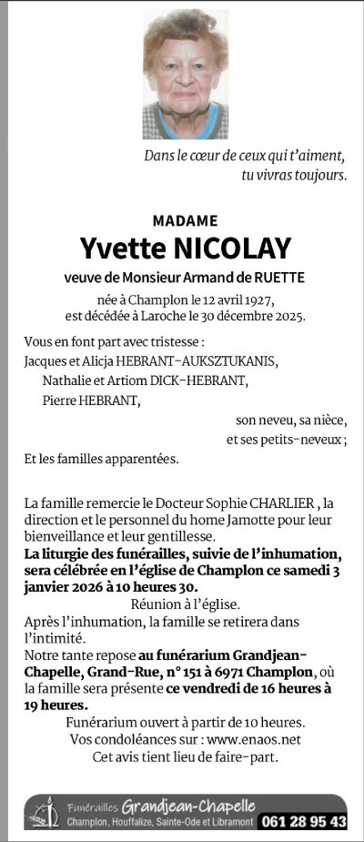 Décédée à La Roche-en-Ardenne (6980, Belgique) le mardi 30 décembre 2025 à l'âge de 98 ans