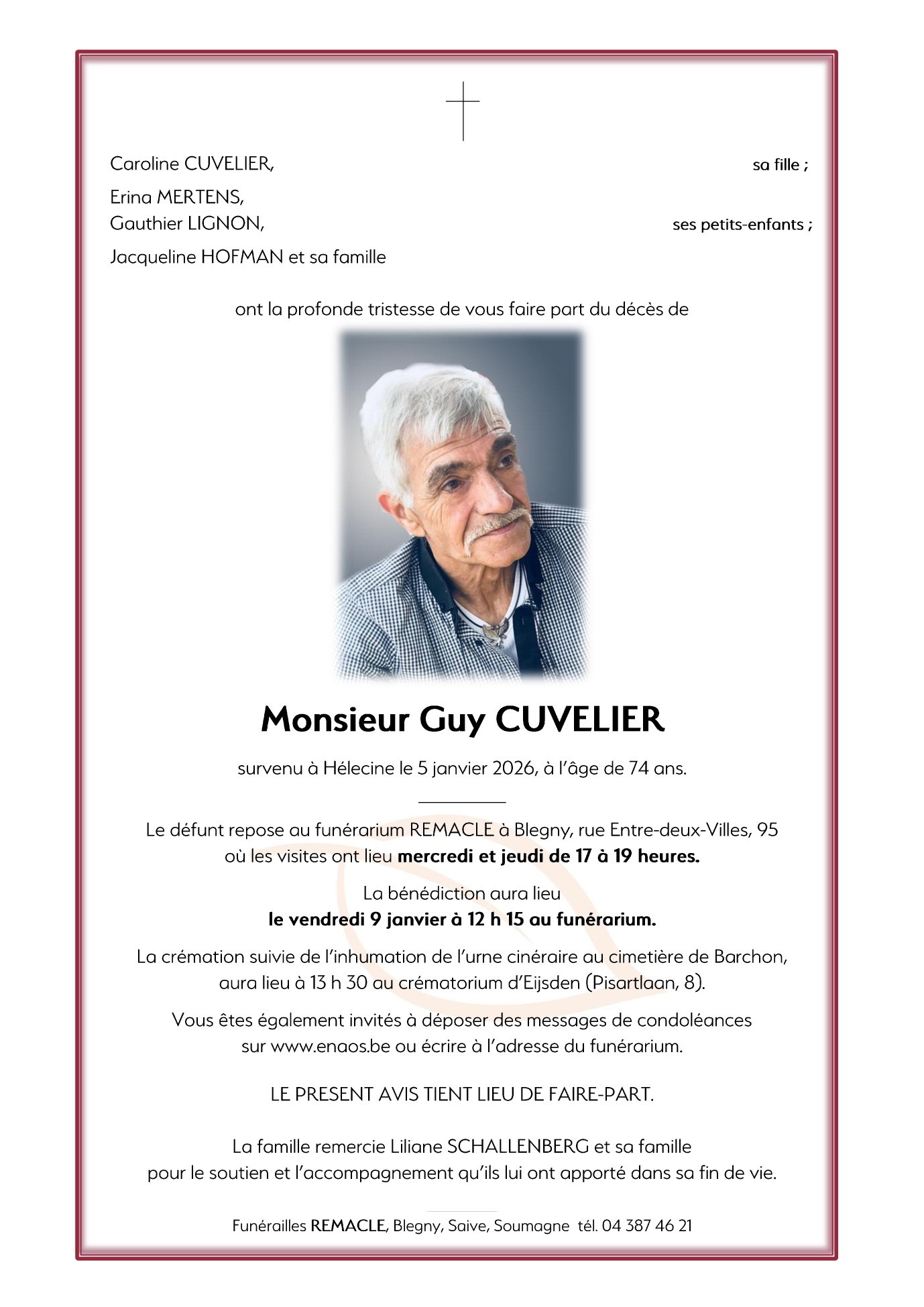 Décédé à Hélécine (1357, Belgique) le lundi 5 janvier 2026 à l'âge de 74 ans