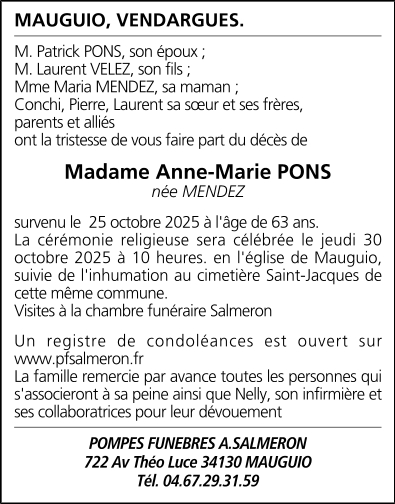 Décédée à Montpellier (34000) le samedi 25 octobre 2025 à l'âge de 63 ans