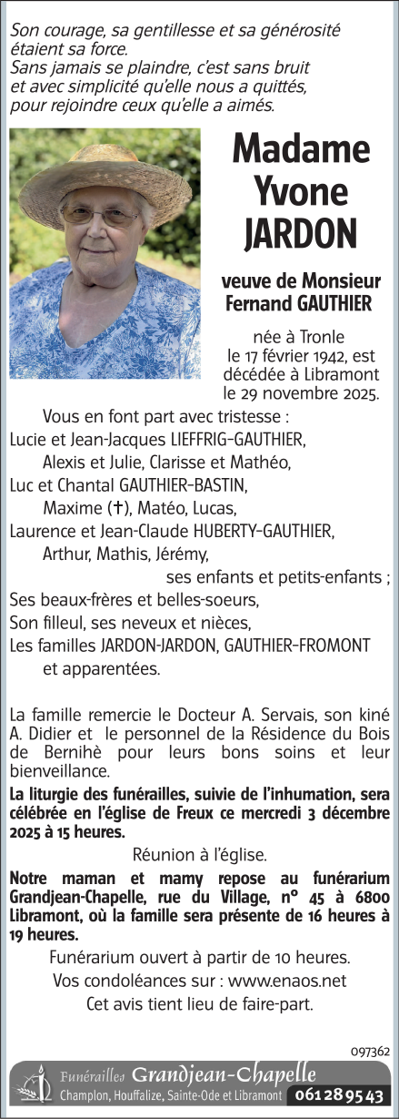 Overleden te Libramont (6800, België) op zaterdag 29 november 2025 op 83-jarige leeftijd