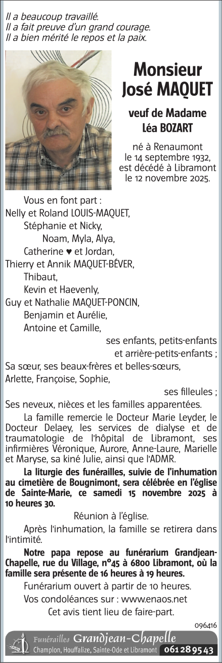 Décédé à Libramont (6800, Belgique) le mercredi 12 novembre 2025 à l'âge de 93 ans