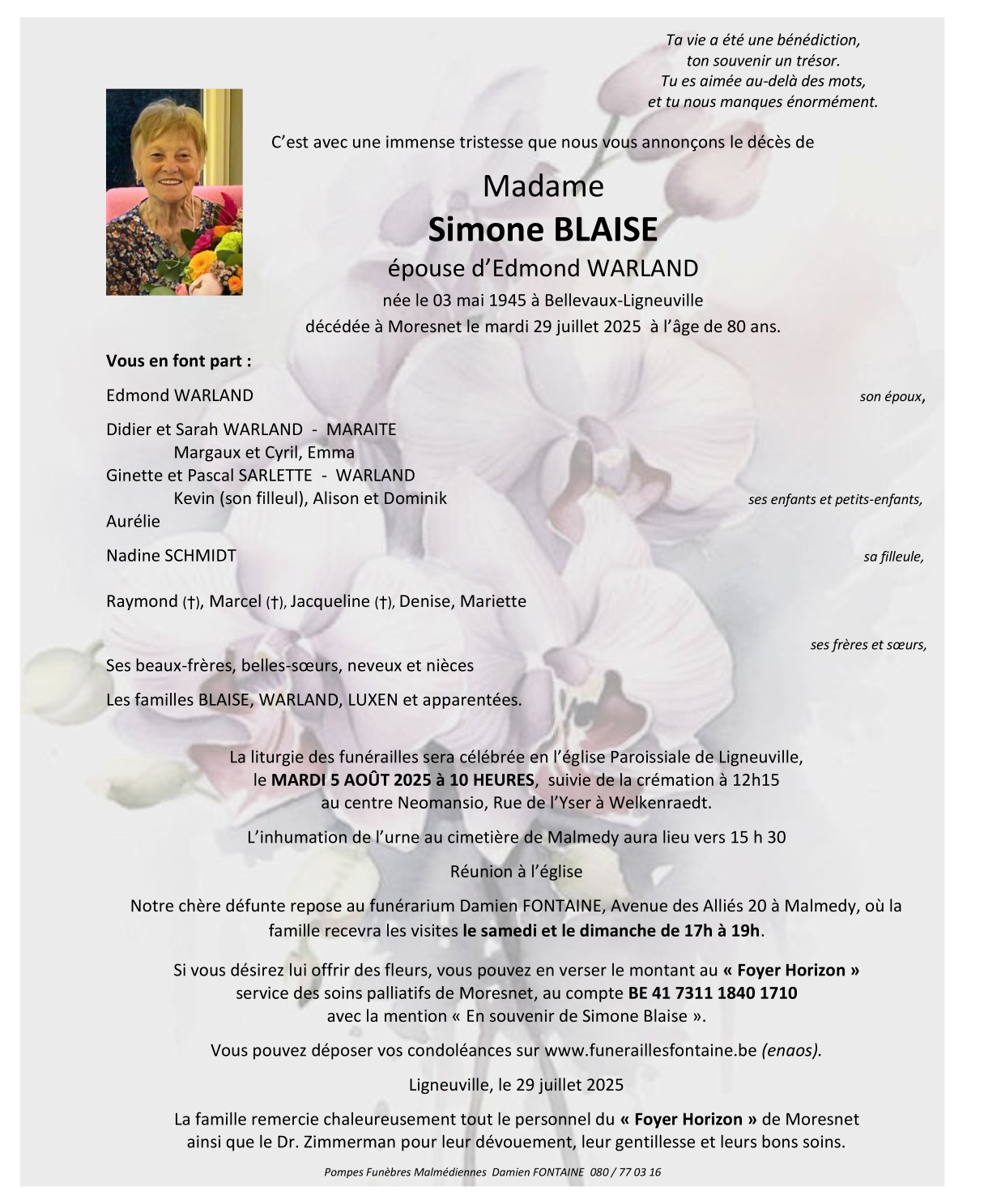 Fallecida en Moresnet (4850, Bélgica) el martes, 29 de julio de 2025 a la edad de 80 años