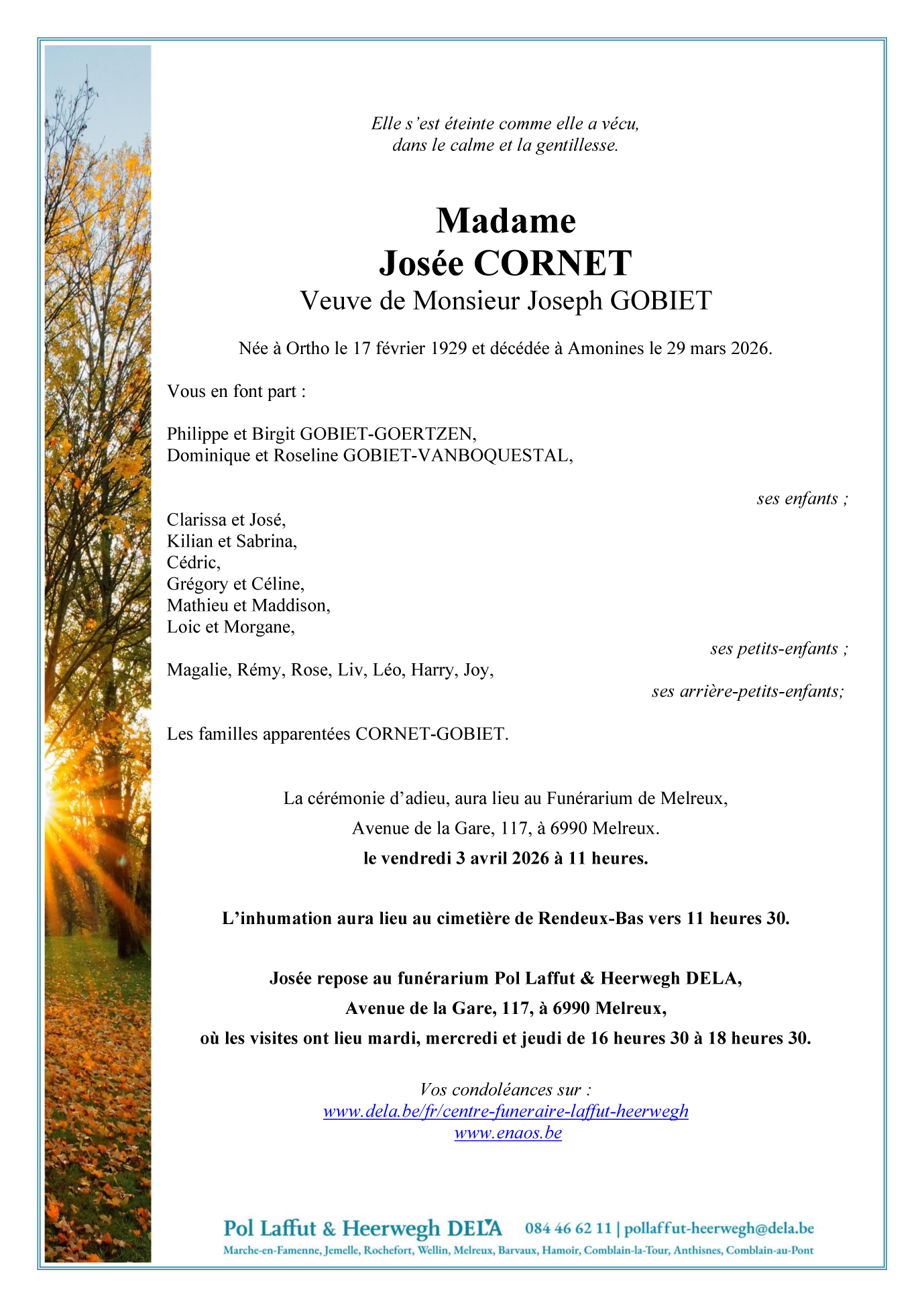 Décédée à Amonines (6997, Belgique) le dimanche 29 mars 2026 à l'âge de 97 ans