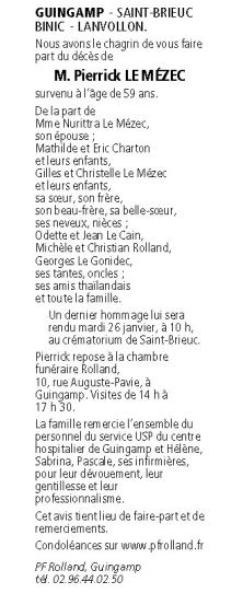 Décédé à Pabu (22200) le jeudi 21 janvier 2021 à l'âge de 59 ans