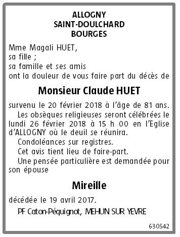 Overleden te Allogny (18110) op dinsdag 20 februari 2018 op 81-jarige leeftijd
