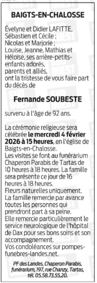 Fallecida en Dax (40100) el domingo, 1 de febrero de 2026 a la edad de 92 años