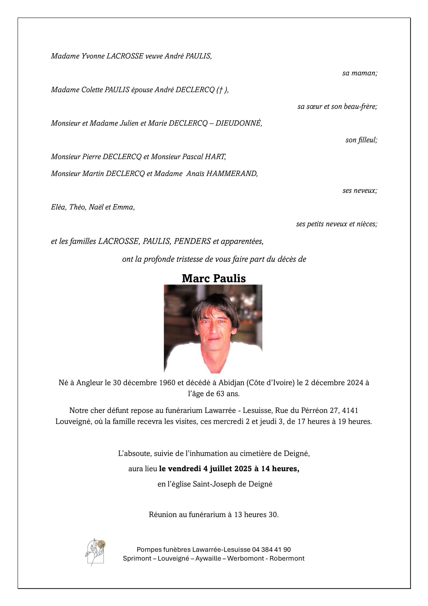 Died in « Localité inconnue » (Belgium) on 02 December 2024 at the age of 63 years