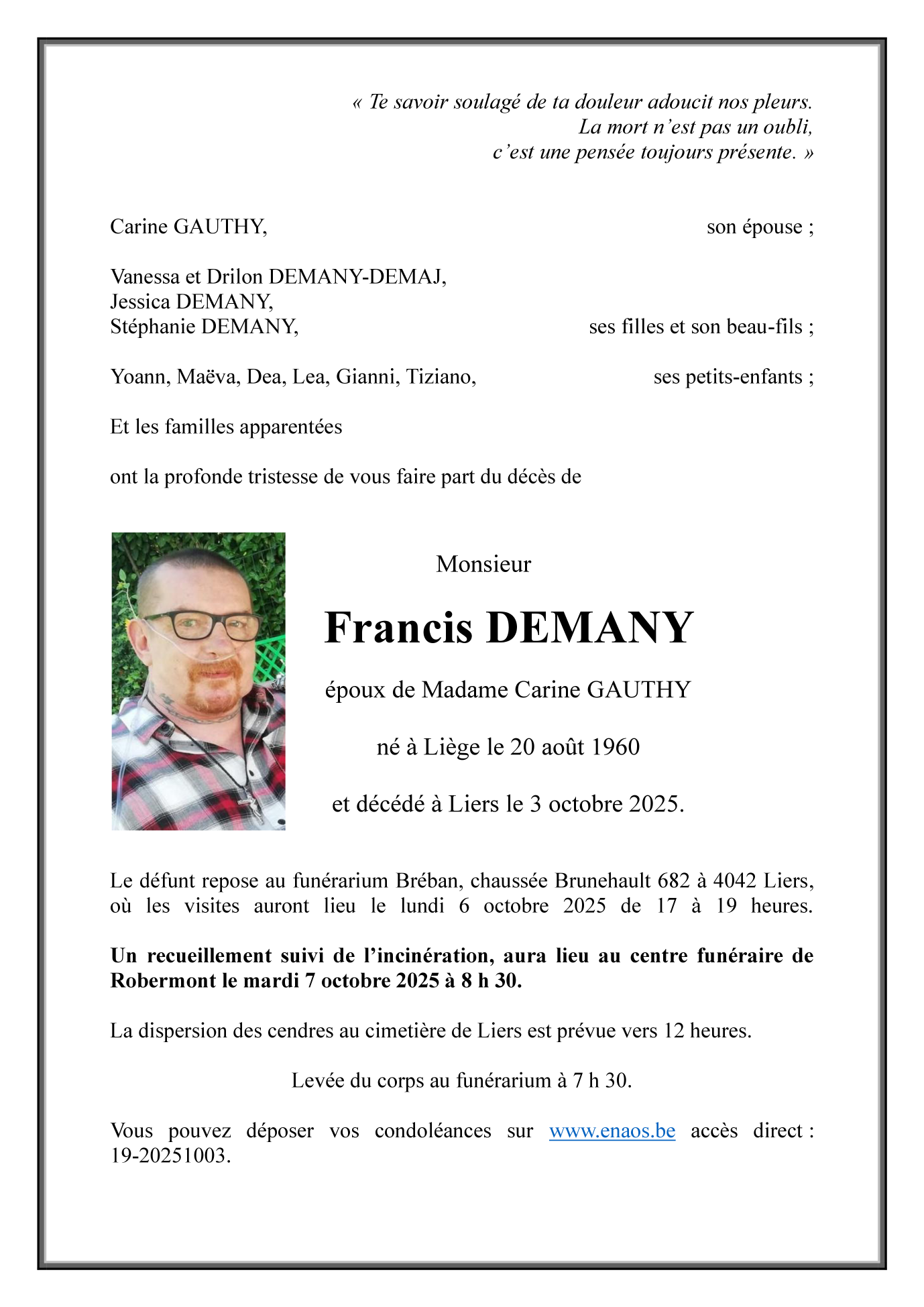 Décédé à Liers (4042, Belgique) le vendredi 3 octobre 2025 à l'âge de 65 ans