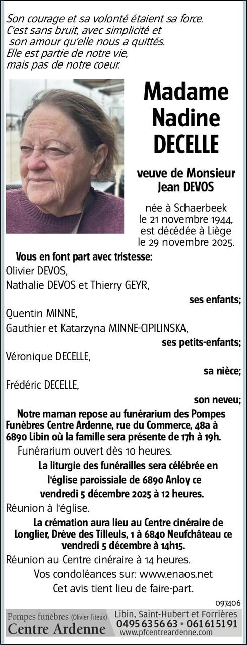 Décédée à Liège (4000, Belgique) le samedi 29 novembre 2025 à l'âge de 81 ans