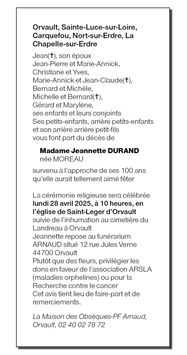 Décédée à Nantes (44000) le mardi 22 avril 2025 à l'âge de 99 ans