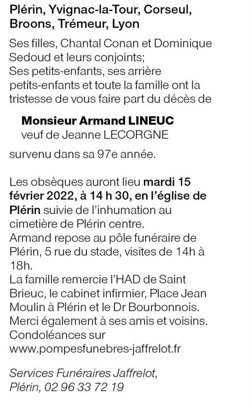 Décédé à Plérin (22190) le vendredi 11 février 2022 à l'âge de 96 ans