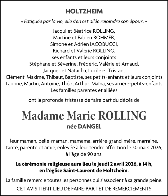 Décédée à Illkirch-Graffenstaden (67400) le lundi 30 mars 2026 à l'âge de 90 ans