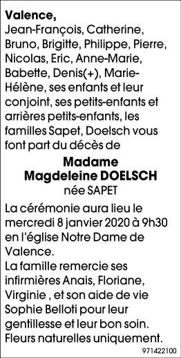 Décédée à Valence (26000) le mercredi 1 janvier 2020 à l'âge de 93 ans