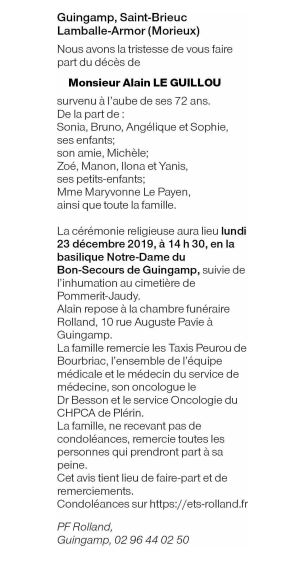 Décédé à Plérin (22190) le jeudi 19 décembre 2019 à l'âge de 71 ans