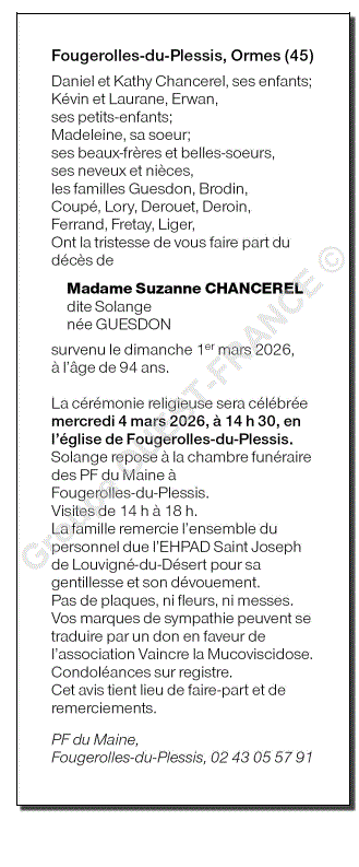Annonce nécrologique de Madame Suzanne CHANCEREL née GUESDON (dite Solange)