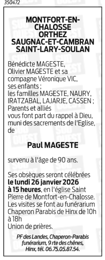 Décédé à Mont-de-Marsan (40000) le mardi 20 janvier 2026 à l'âge de 90 ans