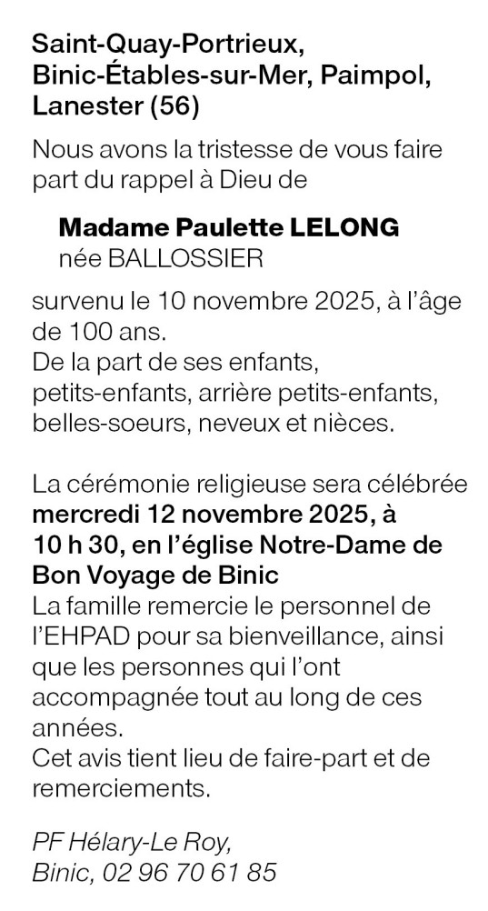 Overleden te Saint-Quay-Portrieux (22410) op maandag 10 november 2025 op 100-jarige leeftijd