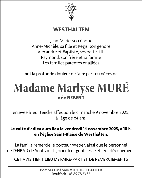 Décédée à Soultzmatt (68570) le dimanche 9 novembre 2025 à l'âge de 84 ans