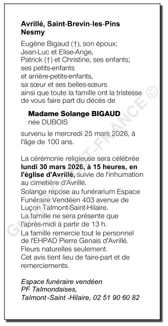 Décédée à Avrillé (85440) le mercredi 25 mars 2026 à l'âge de 100 ans