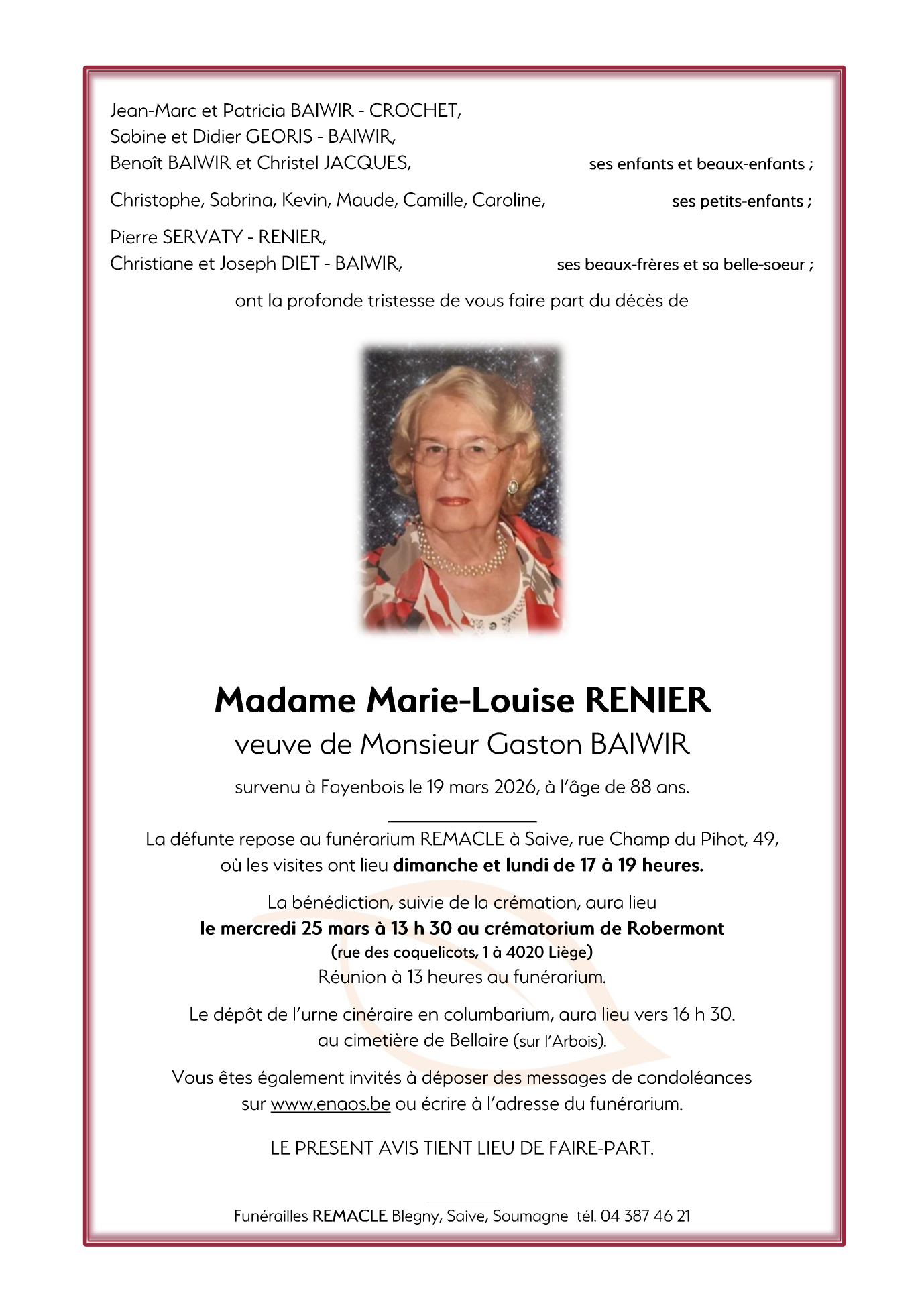 Widow of Monsieur Gaston BAIWIR